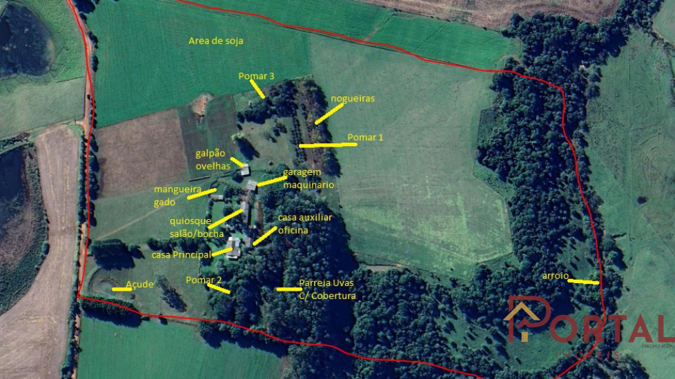 São 26 hectares em Cachoeira do Sul. A propriedade conta com placa solar, poço artesiano, quiosque, salão festas, cancha bocha, energia trifásica, internet fibra ótica e toda uma infraestrutura frutífera com nogueiras, parreiras uva (cobertas), pomares com limão, laranja, bergamota, pêssego, manga, abacate, caqui,... Casa principal tem 5 dormitório, 4 banheiros, cozinha ampla, adega,... Casa auxiliar possui 2 quartos e 1 banheiro Galpões de trabalho, com deposito e oficina e garagem para trator e maquinário Salão festas com banheiro e 3 dormitórios