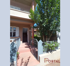 Apartamento com 3 dormitórios, sala de estar, sala de jantar, cozinha, banheiro, lavabo, sacada frontal, pequeno pátio com garagem.