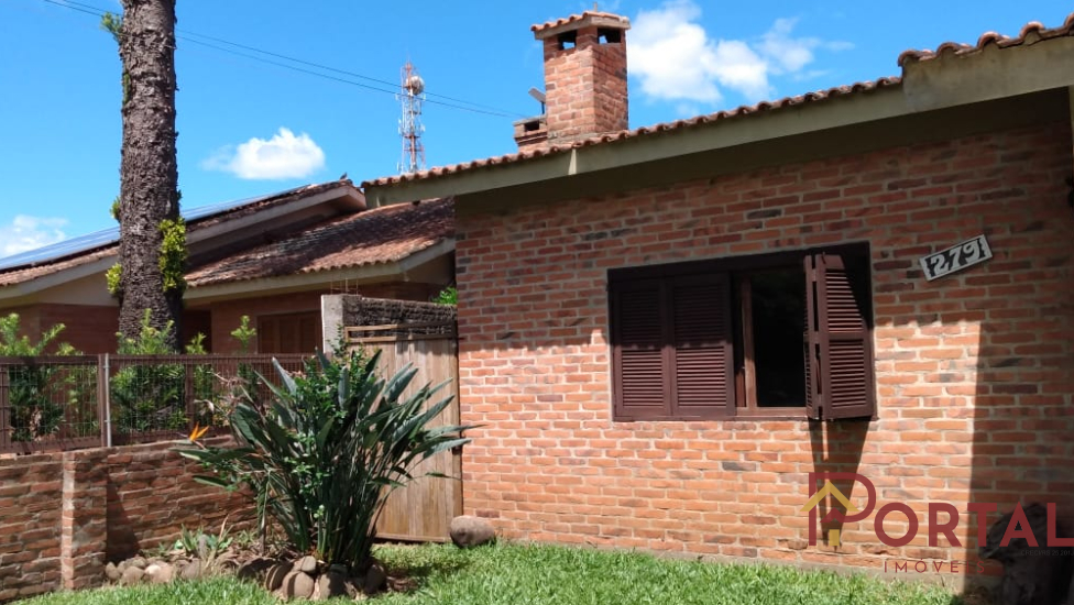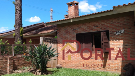 Casa com 2 dormitórios, banheiro social, sala, varanda, cozinha, área de serviço, despensa, lareira, 2 churrasqueiras, garagem, e pátio com piscina